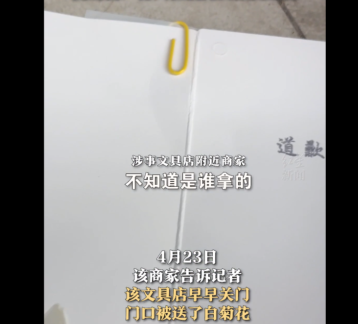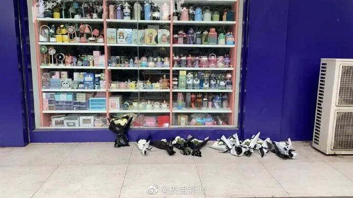 事情引起热议之后,该店铺已从内反锁暂停营业,门口有不少人送来菊花,还附有卡片,写有“关门大吉、早日倒闭”“道歉”等字样。