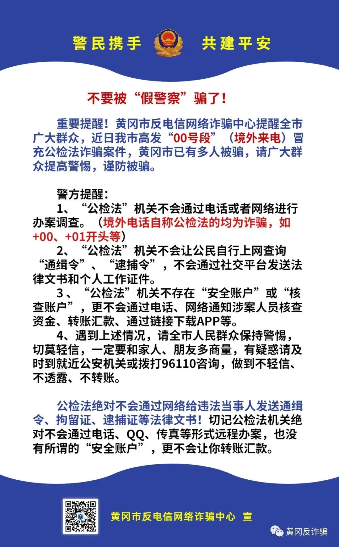 近日黄冈市高发“00号段”(境外来电)冒充公检法诈骗案件,请广大群众提高警惕,谨防被骗。