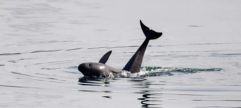 △湖北宜昌,长江葛洲坝下游江面上,江豚在水中嬉戏。