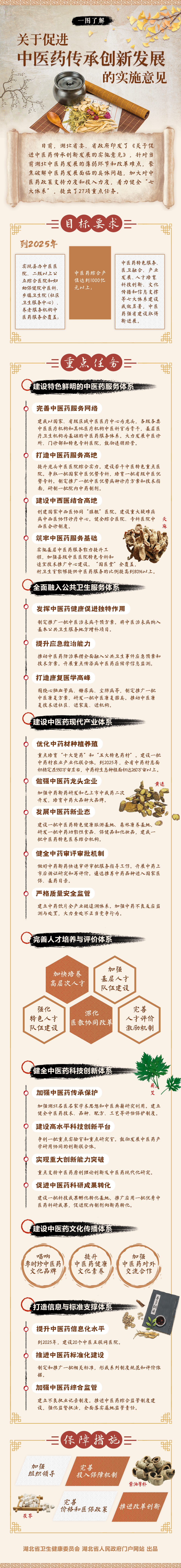 近日,湖北省委、省政府印发《关于促进中医药传承创新发展的实施意见》(以下简称《意见》),结合湖北实际,针对当前中医药发展的薄弱环节和改革难点,聚焦破解中医药发展面临的具体问题,加大对中医药政策支持力度和投入力度,着力健全“七大体系”,提出27项重点任务。