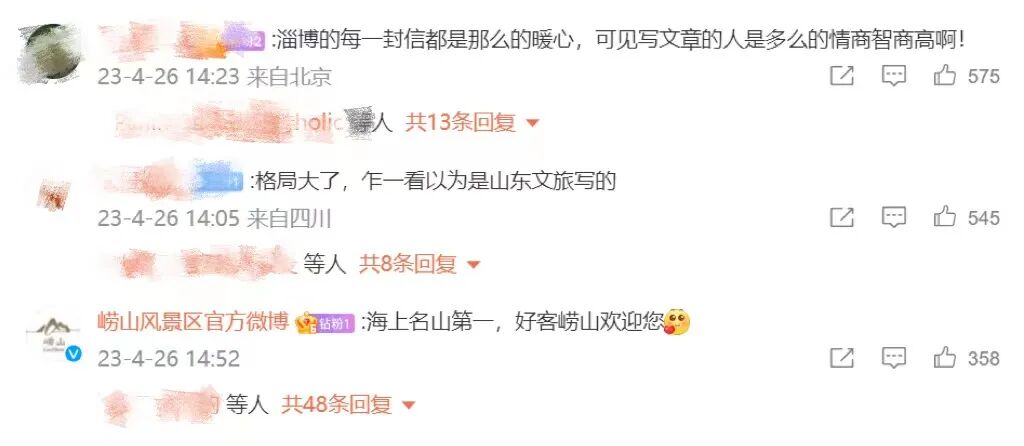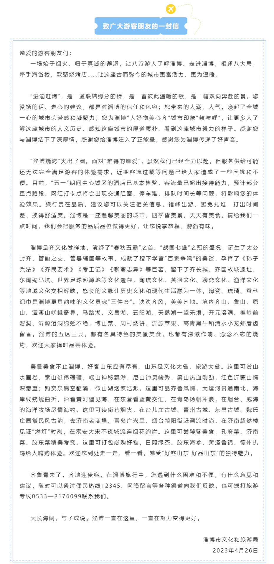 4月26日,淄博发出了一封“劝退”信冲上热搜情真意切的“劝退”信。不仅获得了网友们的支持,还给“好客山东”吸引了一大波游客,把大家对淄博的好感度推上了一个新高度。↓↓↓