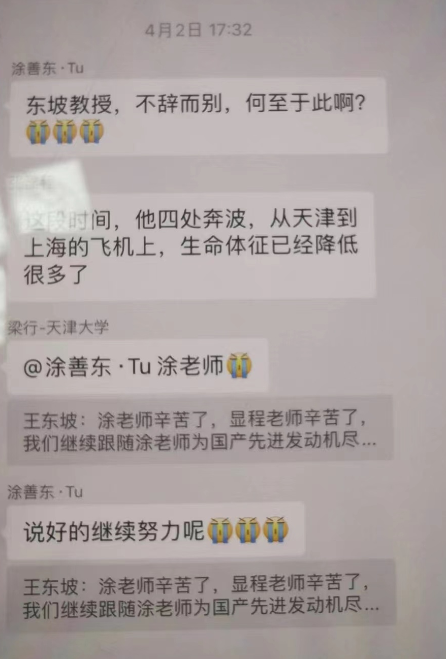 4月4日晚,团队的几位老师带着他的骨灰开车走过了他奋斗过的天津大学。此时已是晚上23时,学生们在他途经的路上默哀告别。