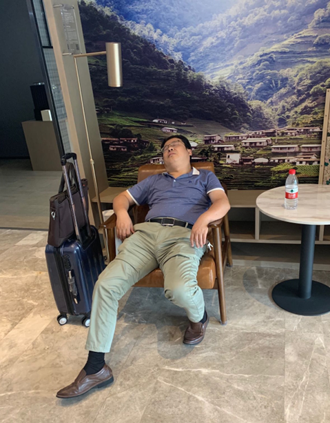 结束了会议,就在梁行在前台办理退房手续的短短几分钟时间,他转身看到了已经仰在沙发上睡着了的王老师,并用手机拍下了这张照片。