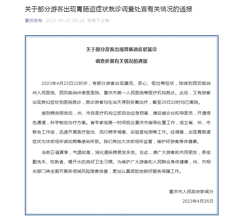 4月27日,云南省景洪市人民政府新闻办对“有部分游客出现腹泻、恶心、呕吐等症状“一事进行通报。经调查,出现胃肠道症状为涉旅场所诺如病毒感染所致。