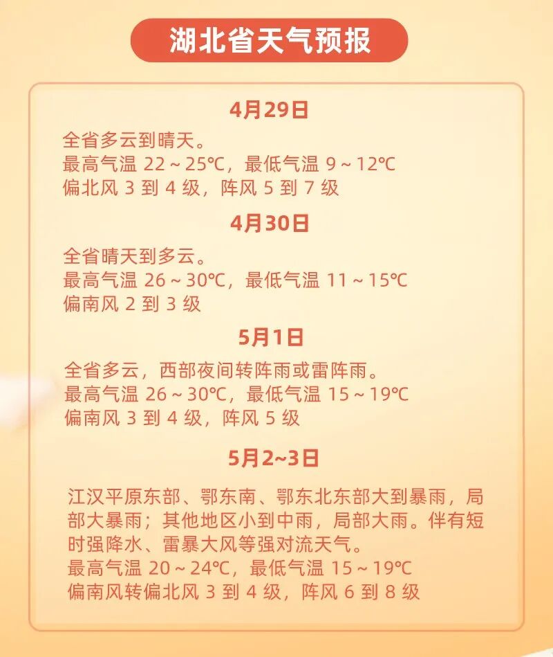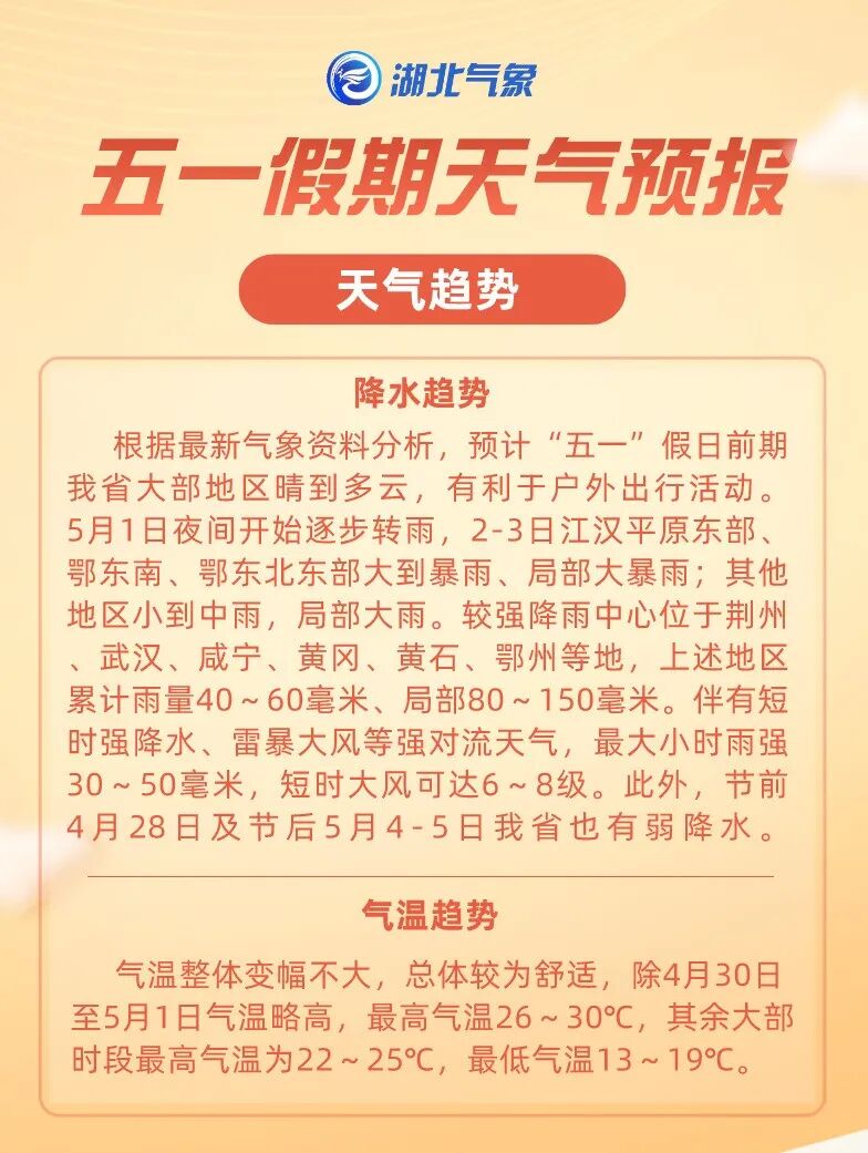 鉴于“五一”假日后期有较强降雨,伴强对流天气,对交通、旅游和农业生产有不利影响。建议:1、加强防范短时强降水、大风、雷电等灾害性天气对交通和旅游安全、城市运行和公众出行等的不利影响。2、做好强降雨引发的山洪、滑坡及城乡内涝灾害防御工作。3、抢晴加快春耕春播进度,后期做好田间管理,防范风雨天气的不利影响。