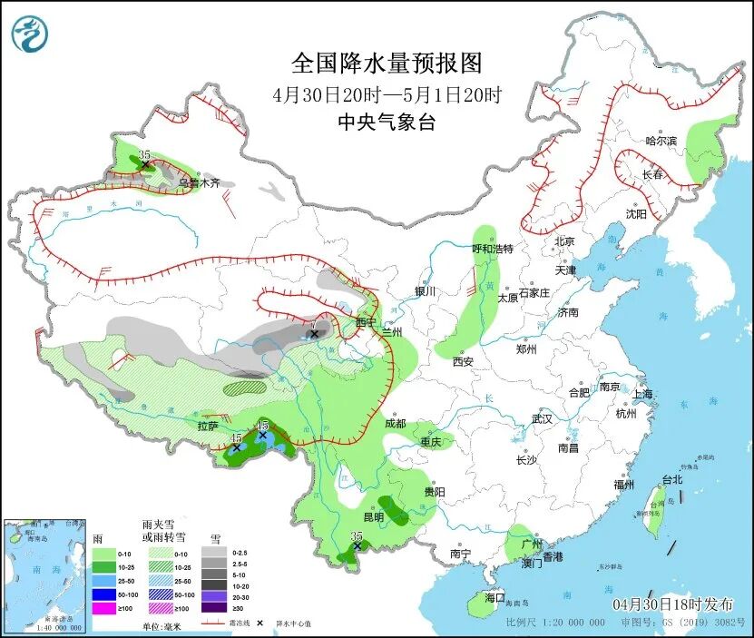 中央气象台预计,4月30日20时至5月1日20时,新疆沿天山地区和伊犁河谷、西藏东北部和中部、青海东部等地部分地区有小到中雪或雨夹雪,其中,西藏东北部、青海东部等地部分地区有大雪。黑龙江东南部、西藏东部、陕西北部、西南地区大部、海南岛、台湾岛等地部分地区有小到中雨,局地有大雨。