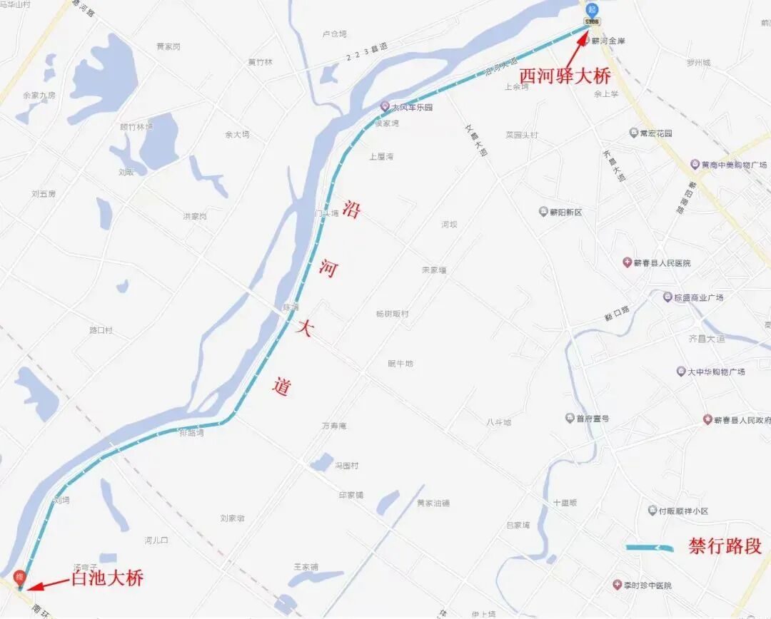 蕲春沿河大道西河驿大桥至白池大桥路段,实行全天24小时禁止货车通行,自2023年5月10日起启用电子设备抓拍。