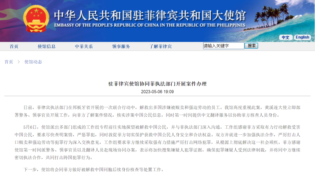5月6日,中国驻菲律宾大使馆发布消息称,日前,菲律宾执法部门在邦板牙省开展的一次联合行动中,解救出多国涉嫌被贩卖和强迫劳动的员工。使馆高度重视此案,黄溪连大使立即部署警务、领事官员开展工作,向菲方了解案件情况,核实涉案中国公民信息,同时第一时间提供中文翻译服务以协助菲方核查人员身份。