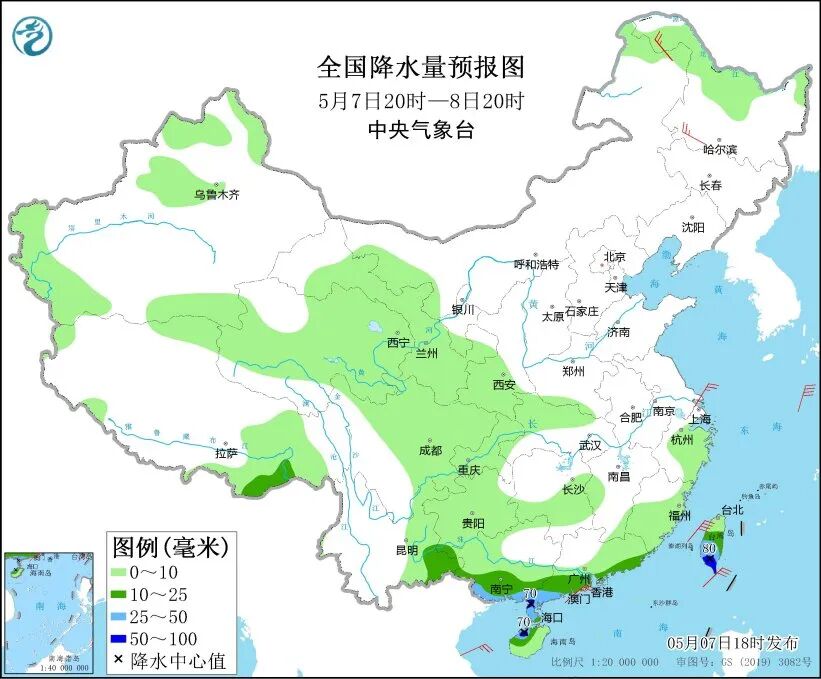 中央气象台预计,7日20时至8日20时,新疆北部、青海南部、西藏北部等地部分地区有小到中雪或雨夹雪,局地有大雪;西藏东南部、云南东南部、广西南部、广东西南部、台湾岛等地部分地区有中到大雨,其中,广西东南部、广东西南部、海南岛北部、台湾岛南部等地部分地区有暴雨。