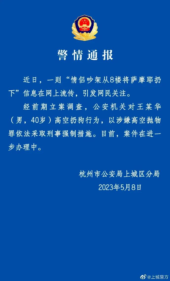 杭州市公安局上城分局通报:近日,一则“情侣吵架从8楼将萨摩耶扔下”信息在网上流传,引发网民关注。经前期立案调查,公安机关对王某华(男,40岁)高空扔狗行为,以涉嫌高空抛物罪依法采取刑事强制措施。目前,案件在进一步办理中。
