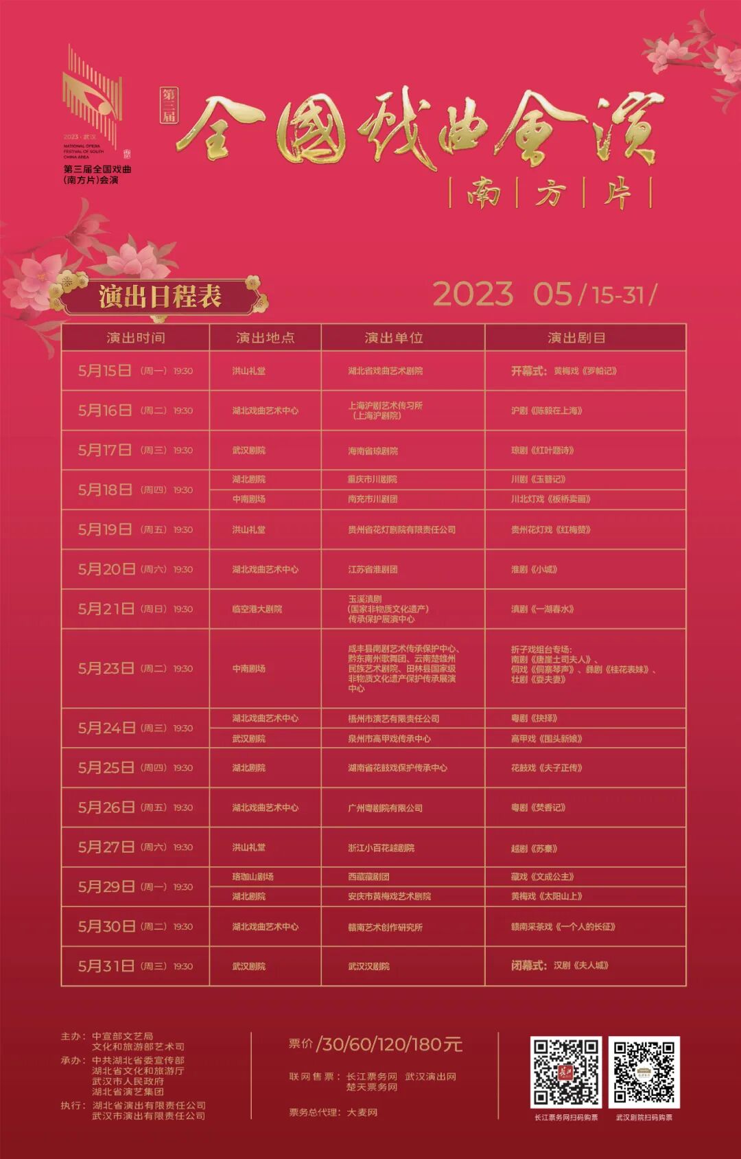会演期间,还将组织专家、学者、艺术家、参演院团代表和观众,开展剧目观摩、座谈研讨等艺术交流研讨活动,共同为发扬光大中华优秀戏曲文化、振兴武汉戏曲“大码头”加油助力、建言献策。本次会演由中宣部文艺局、文化和旅游部艺术司主办,中共湖北省委宣传部、湖北省文化和旅游厅、武汉市人民政府、湖北省演艺集团承办,湖北省演出有限责任公司、武汉市演出有限责任公司执行。