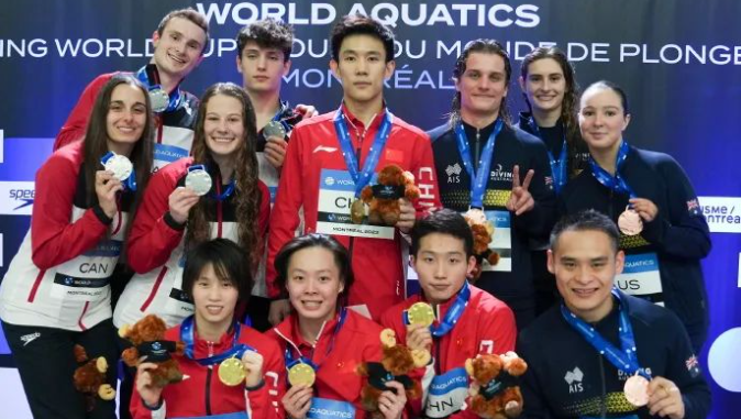 2023年世界泳联跳水世界杯蒙特利尔站落幕,中国跳水“梦之队”以9金1银的成绩位列奖牌榜第一。