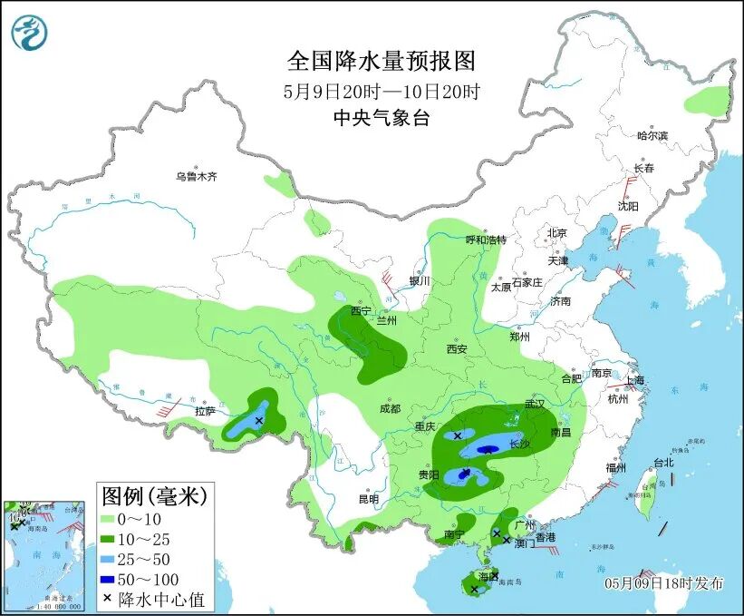 中央气象台预计,9日20时至10日20时,西藏北部和东部、青海东部和南部、甘肃南部等地的部分地区有小到中雪或雨夹雪,其中青海东南部等地局地大到暴雪;西藏东南部、贵州东部、湖南中北部和西部、广西北部和西南部、广东西南部、海南岛等地部分地区有中到大雨,其中,湖南中西部、贵州东南部等地部分地区有暴雨。