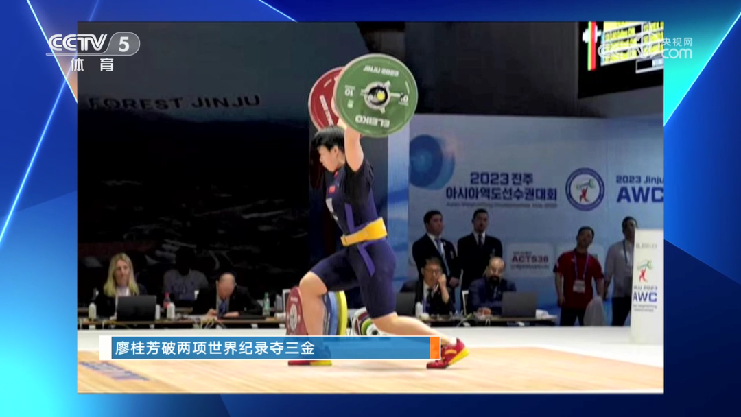 9日,2023年亚洲举重锦标赛女子71公斤级决赛,中国选手廖桂芳夺得三枚金牌,并打破两项世界纪录。