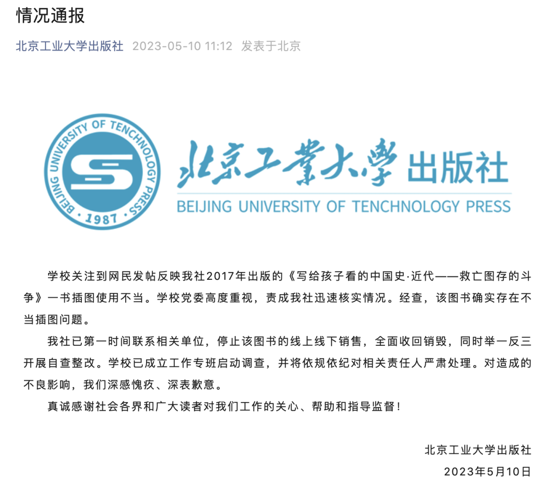 据了解,该系列历史读物名为《写给孩子看的中国史》,出版方为北京工业大学出版社。10日,北京工业大学出版社发布情况通报称,该图书确实存在不当插图问题。已第一时间联系相关单位停止销售,全面收回销毁。学校已成立工作专班启动调查,并将依规依纪对相关责任人严肃处理。