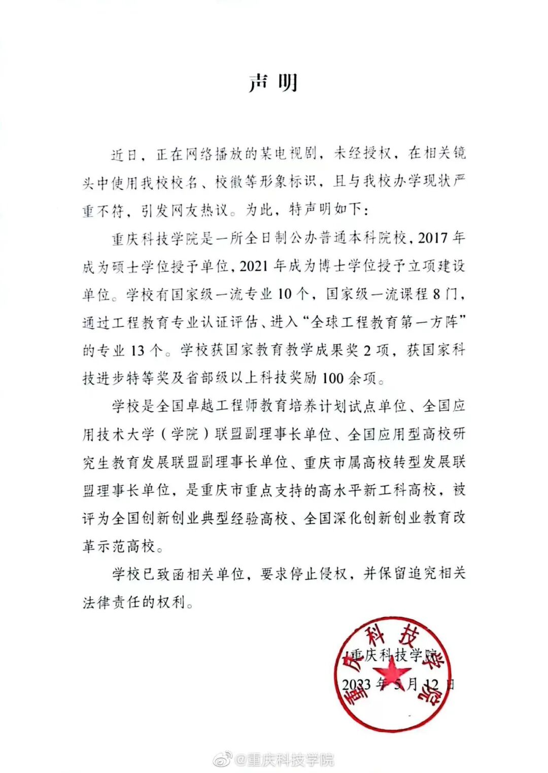 5月12日,重庆科技学院发布声明称:近日,正在网络播放的某电视剧,未经授权,在相关镜头中使用该校校名、校徽等形象标识,“与我校办学现状严重不符”,引发网友热议。声明介绍道,重庆科技学院是一所全日制公办普通本科院校,2017年成为硕士学位授予单位,2021年成为博士学位授予立项建设单位。