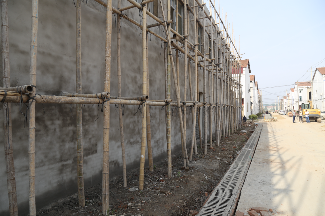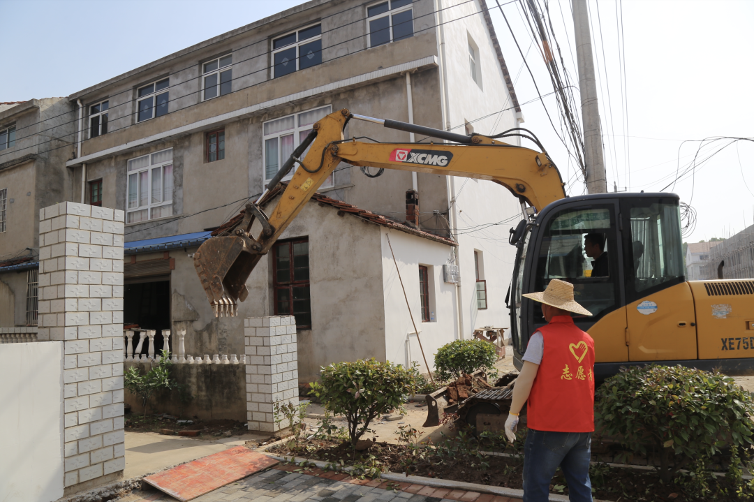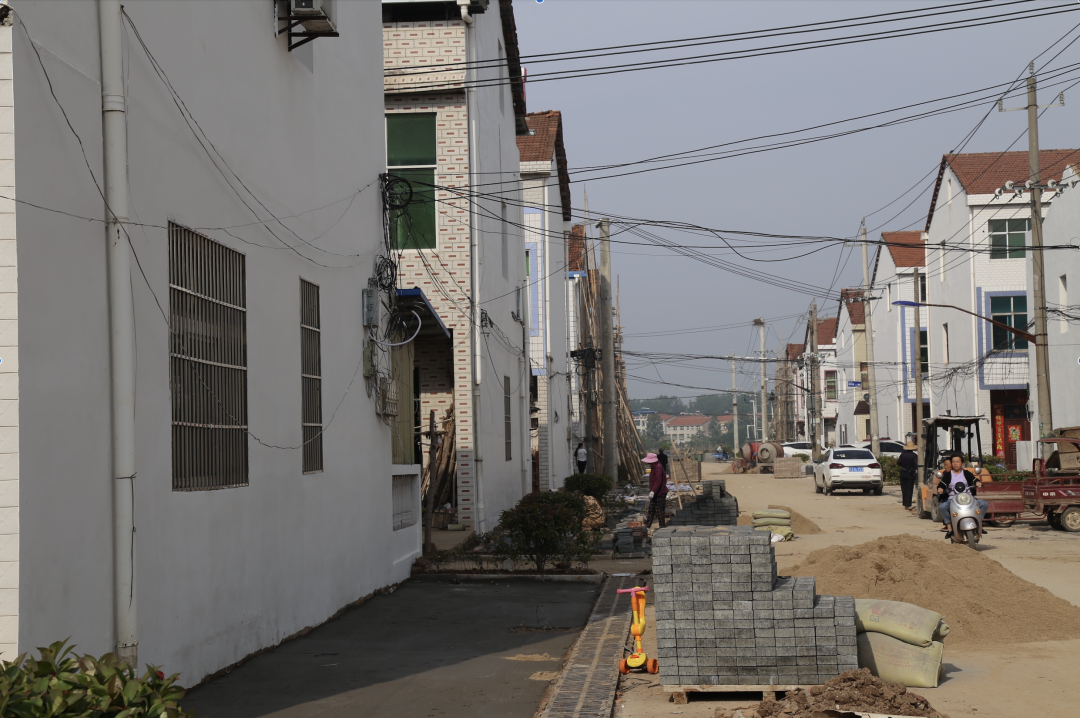 5月13日早晨不到8点钟,黄州区堵城镇江咀村申通路两侧,农用车来回穿梭,运输渣土、水泥和黄砂等物料。工人们有的在铺设步道砖,有的在拆除钢构棚。农户们忙着清理自家门口堆放多年的柴草和砖石等杂物,到处一片繁忙景象。
