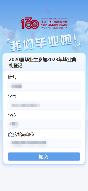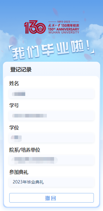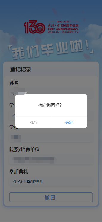 校友身份认证成功后,再进行登记,点击提交,您的登记成功!如果您不能来参加毕业典礼,可以点击撤回。