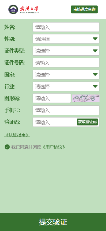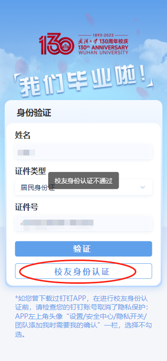 进行身份验证,输入姓名,选择证件类型,输入证件号,点击验证。如校友身份认证不通过,请点击校友身份认证,填写个人基本信息,提交验证。