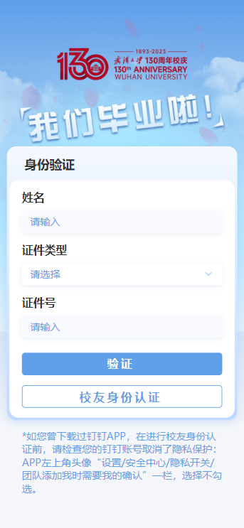 温馨提示:如您曾下载过钉钉APP,在进行校友身份认证前,请检查您的钉钉账号是否取消了隐私保护: APP左上角头像”设置/安全中心/隐私开关/团队添加我时需要我的确认”一栏,选择不勾选。