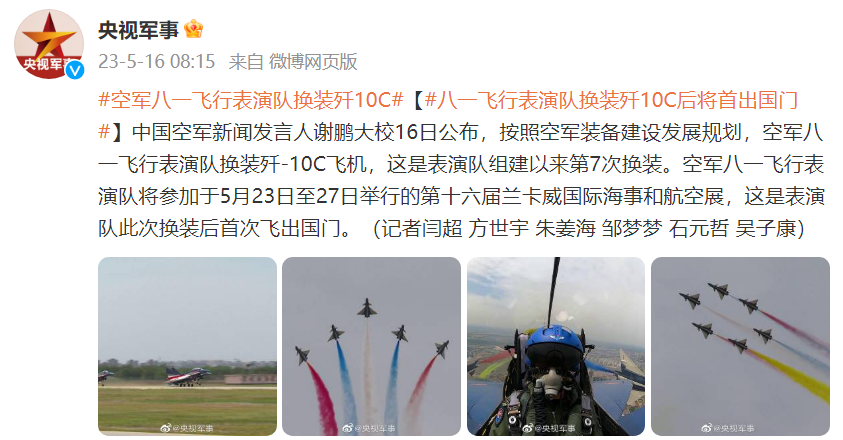 中国空军新闻发言人谢鹏大校16日公布,按照空军装备建设发展规划,空军八一飞行表演队换装歼-10C飞机,这是表演队组建以来第7次换装。