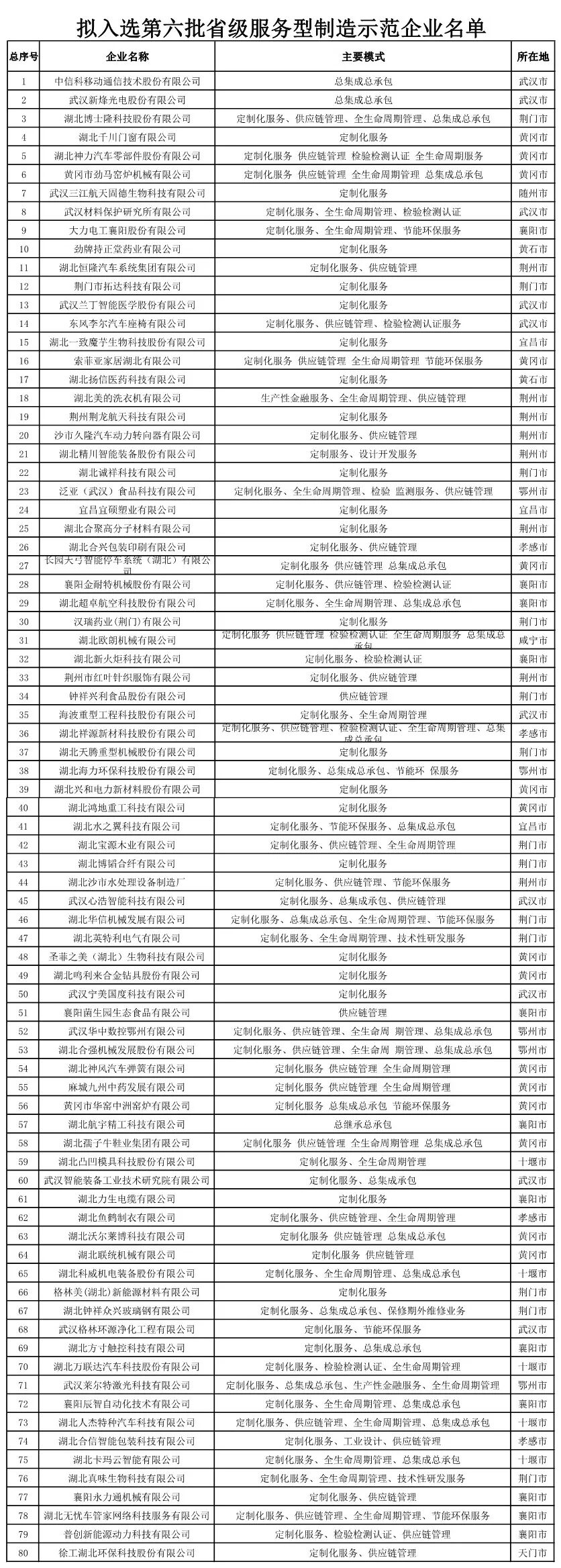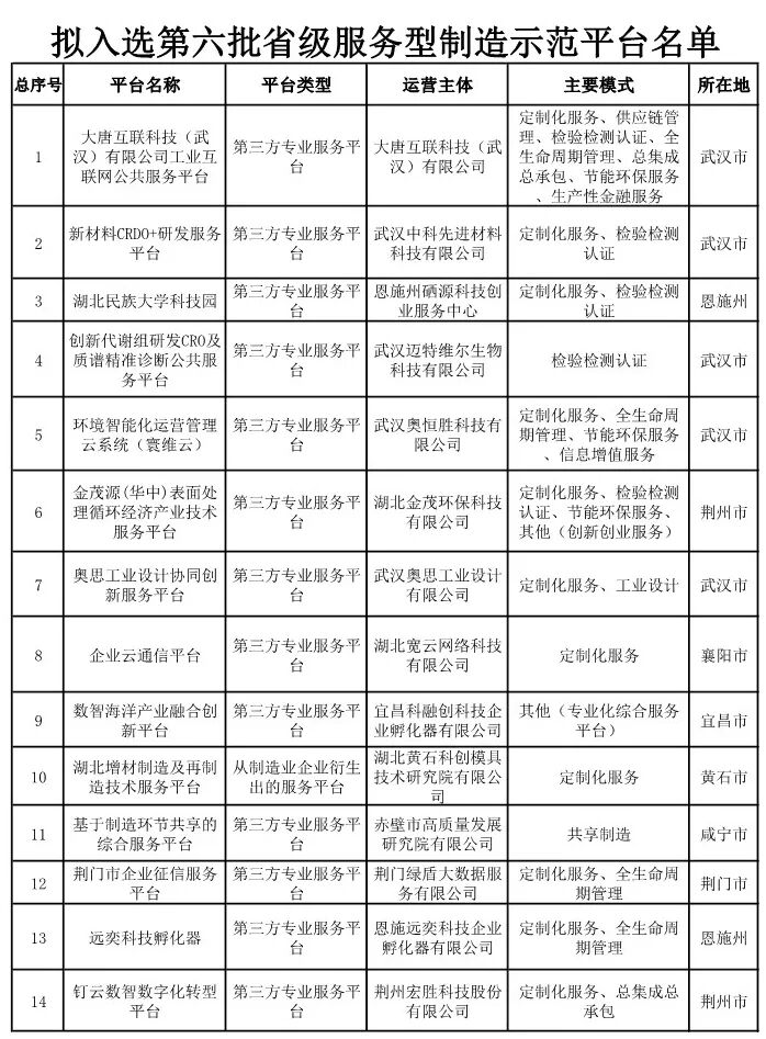 根据《省经信厅办公室关于开展第六批省级服务型制造示范企业、平台遴选工作的通知》,现将拟入选第六批省级服务型制造示范企业、平台的名单进行公示,请社会各界监督。如有异议,请在公示期内将意见书面反馈至湖北省经济和信息化厅产业政策处。
