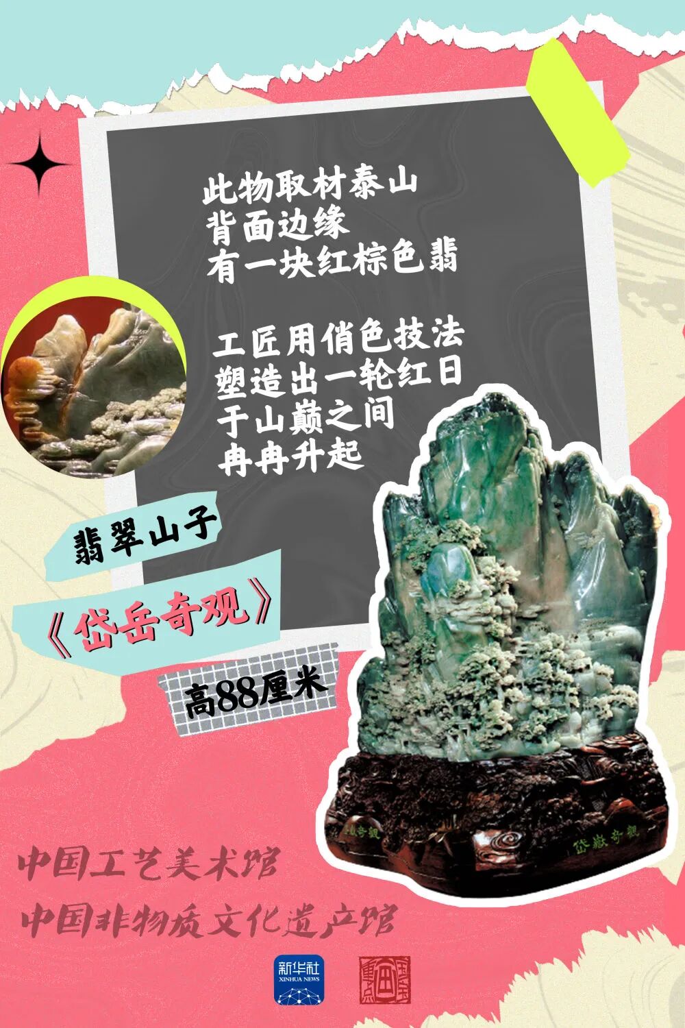 中国工艺美术馆(中国非物质文化遗产馆)馆藏的翡翠山子《岱岳奇观》让人叹为观止,它采用镂雕、圆雕、深浅浮雕等工艺手法,体现层层叠叠的树木、小桥。中景、远景采用浅浮雕、阴刻等手法,使之深远。作品背面用铁线篆体字刻唐代诗人杜甫的《望岳》,填以金色,风格古朴高雅,书法和工艺造型相映生辉。