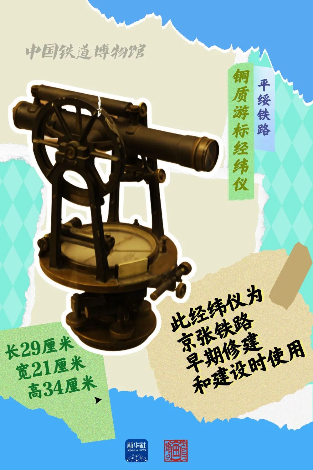 这件平绥铁路使用的铜质游标经纬仪,为京张铁路早期修建和建设时使用。该经纬仪制作精良,在当时属于具有较高科学技术水平的设备。2009年张家口车务段将其捐赠给中国铁道博物馆正阳门展馆。