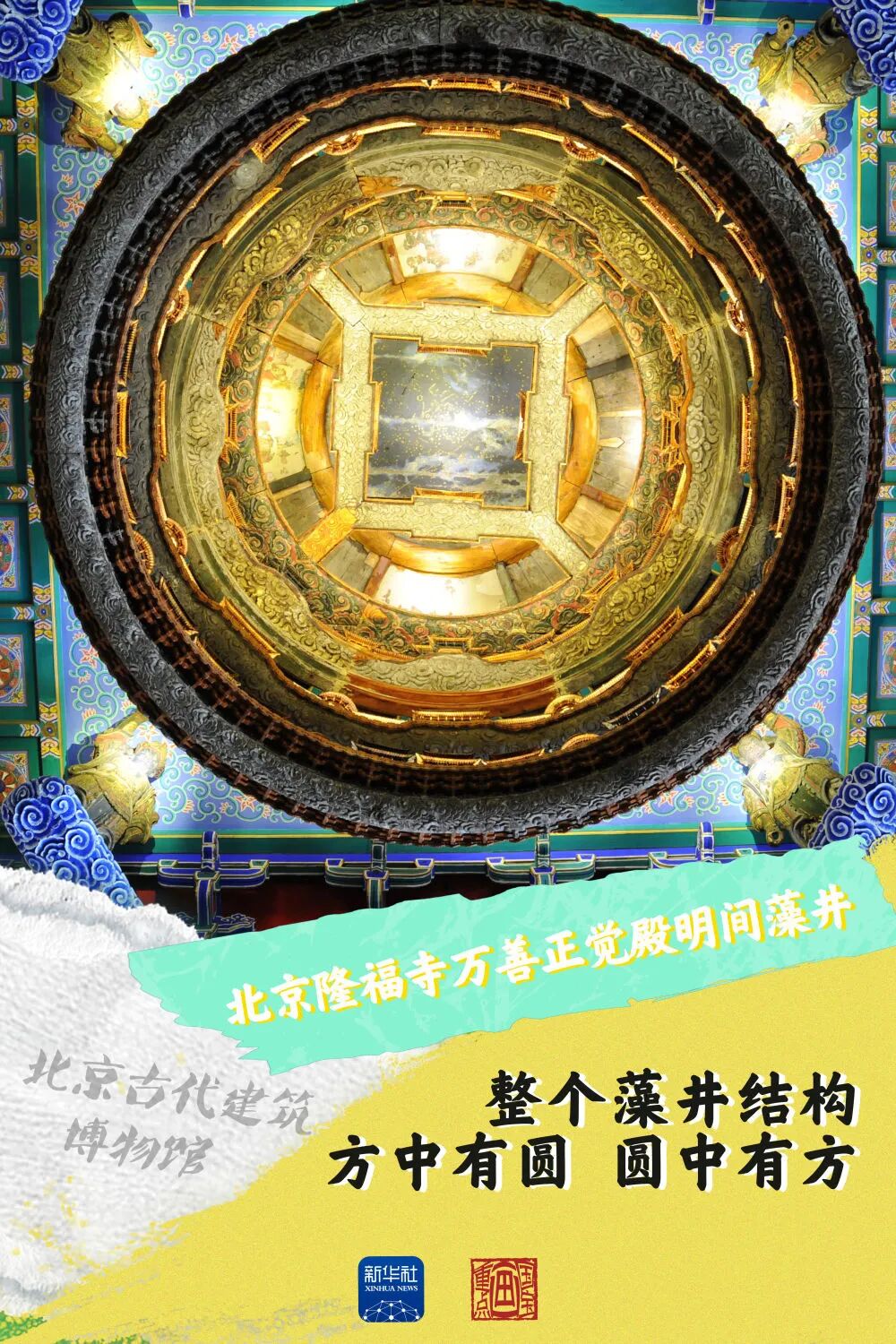 北京古代建筑博物馆的镇馆之宝是这座美轮美奂的藻井,整个藻井的结构为方井内含圆井,圆井内又含方井。藻井四角立力士雕像,意在托起中心圆井。圆井应为六层框架,现存有五层,其中几层之上布置有天上宫阙。宫阙里有精雕细琢的仙人天女,表情神态极为细腻。藻井的最上方是一幅星象图,在灯光照射下宛若星河。