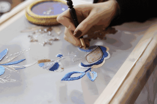 让传统刺绣工艺和简单的干花粘贴结合使用