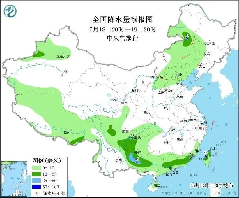 中央气象台预计,至19日20时,内蒙古东部、华北中北部、新疆北部、西南地区东部、华南大部等地部分地区有小到中雨,局地有大雨或暴雨。