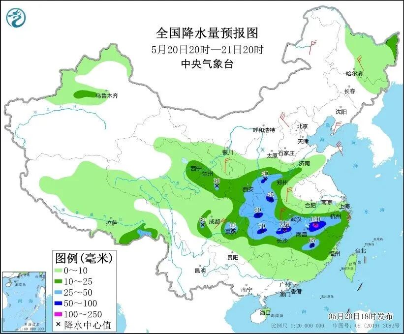 中央气象台20日18时发布暴雨蓝色预警,预计20日20时至21日20时,西南地区东部至长江中下游地区有分散性强降水,陕西东南部、甘肃南部、河南西部、湖北西部和南部、安徽南部、湖南北部、江西中北部、浙江西部以及重庆北部和西南部、贵州北部等地部分地区有大到暴雨,其中,湖南东北部、江西东北部等地局地有大暴雨。上述部分地区伴有短时强降水,局地有雷暴大风、冰雹等强对流天气。