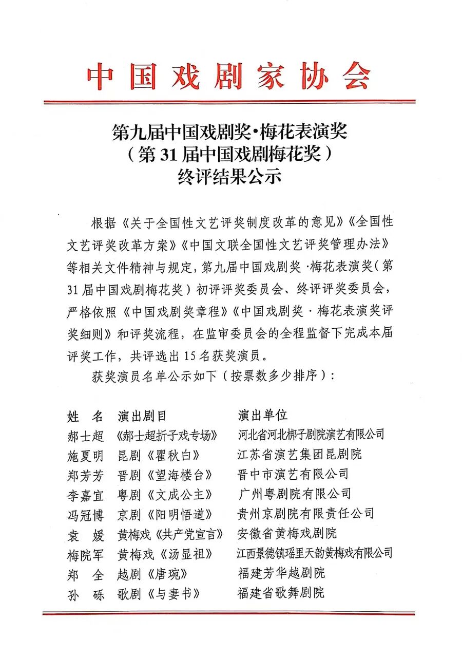19日,中国戏剧家协会公布第九届中国戏剧奖·梅花表演奖(第31届中国戏剧梅花奖)终评结果,共15名演员获奖。滑动查看详情↓
