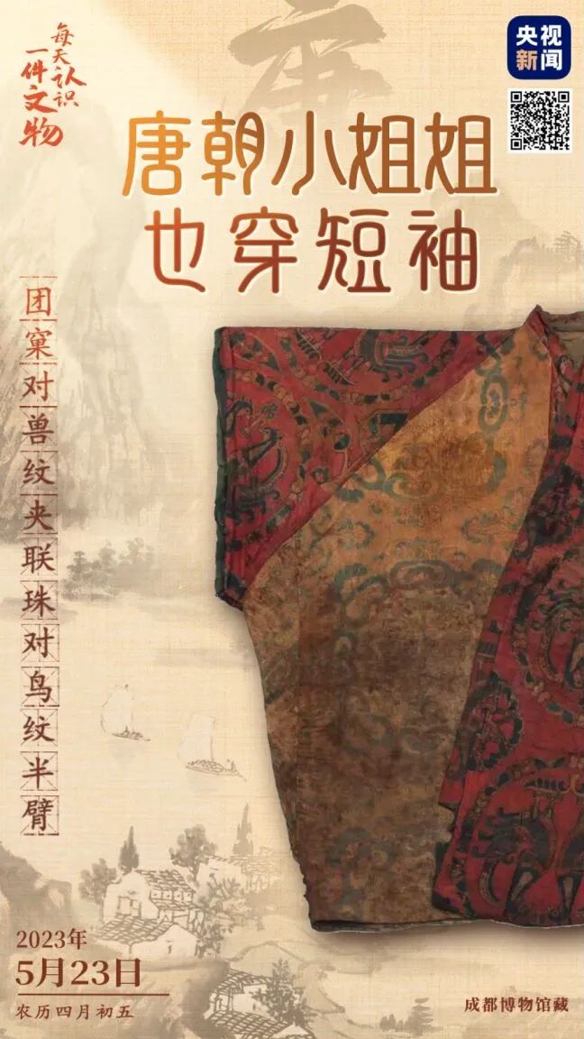 央视新闻联合全国博物馆推出文博科普产品《文博日历》,每天带您认识一件文物。“半臂”是唐代女子常服的一种。它袖长及肘、身长及腰,可套在裙子外或搭配在衣服里面。这件团窠对兽纹夹联珠对鸟纹半臂是“撞色+拼接”设计,黄色部分为中国蜀锦,红色部分为西方粟特锦。两种不同风格的织物搭配,精妙绝伦!长按识别图中二维码,即可预约参观↓