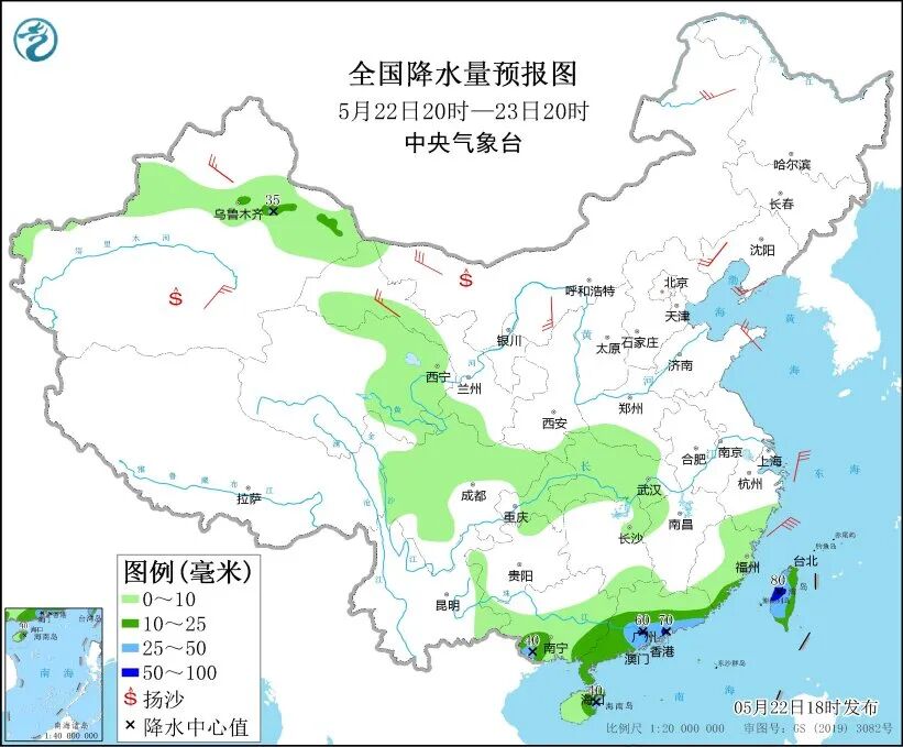 中央气象台预计,22日20时至23日20时,新疆沿天山地区、华南中南部、台湾岛等地部分地区有中到大雨,其中,广东南部沿海、台湾岛中部等地部分地区有暴雨。