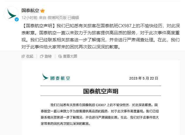 我们已知悉有关旅客在国泰航班CX987上的不愉快经历,对此深表歉意。国泰航空一直以来致力于为旅客提供高品质的服务,对于此次事件高度重视。我们已经联系相关旅客进一步了解情况,并会进行严肃调查处理。在此,我们对于此事件给大家带来的困扰再次致以深深的歉意。