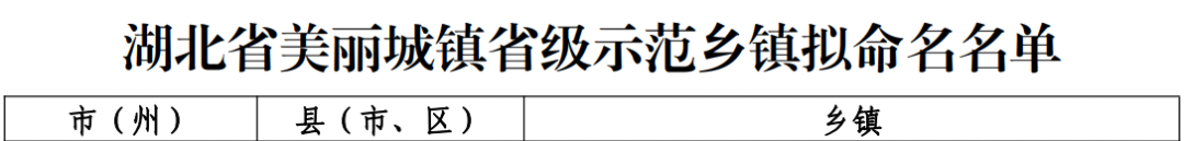 根据《关于开展“擦亮小城镇”建设美丽城镇三年行动总体评价工作的通知》,经乡镇自评、县级初评、市级评价、省级复核等程序,现对湖北省美丽城镇省级示范乡镇拟命名名单予以公示,公示时间为2023年5月22日至2023年5月26日。如对拟命名对象有异议,请于5月26日前向省住房和城乡建设厅反映。反映形式为电话、信函、电子邮件,信函以到达日邮戳为准。以单位名义反馈情况的材料需加盖单位公章,以个人名义反映情况的材料应署实名,并提供联系电话。