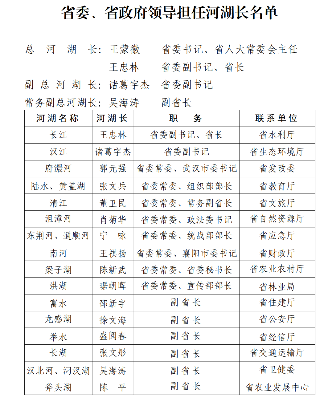 近日,根据省级领导工作联系点安排调整情况,湖北省河湖长制办公室印发通知,对省委、省政府领导担任省级河湖长及其联系单位予以明确,共17名省委、省政府领导担任省级河湖长,16个省直部门担任19条河湖的联系单位。