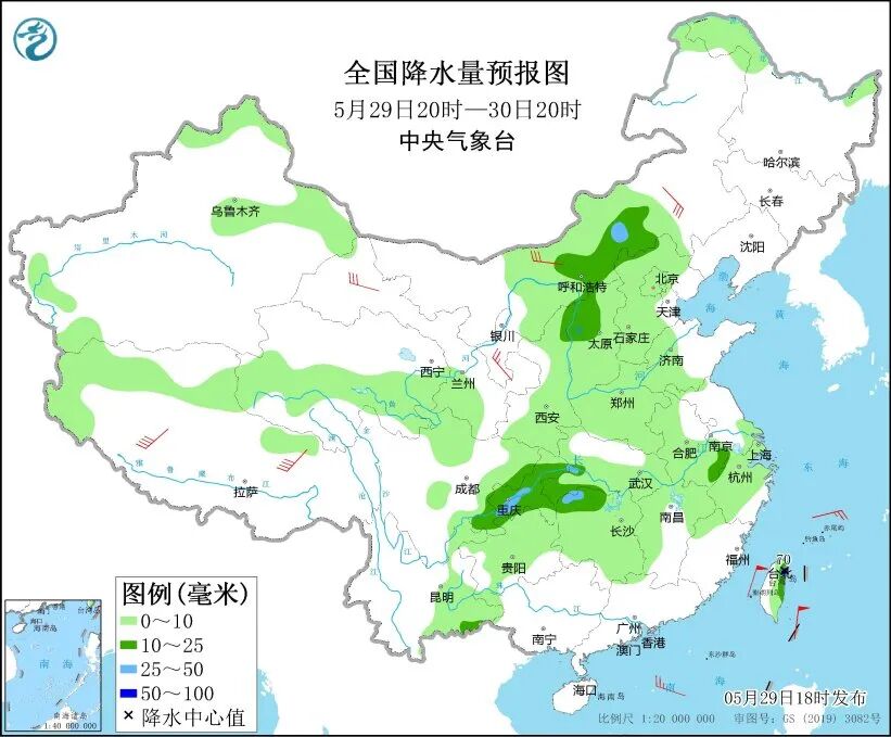 中央气象台预计,29日20时至30日20时,内蒙古中部、陕西北部、山西中北部、河北北部、安徽南部、湖北南部、湖南北部、西南地区东北部、台湾岛东部等地部分地区有中到大雨,其中,台湾岛东部等地部分地区有暴雨。