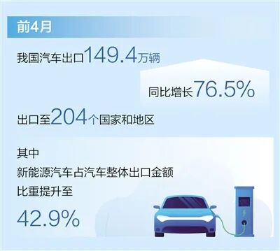今年前4月,我国汽车出口149.4万辆,同比增长76.5%。