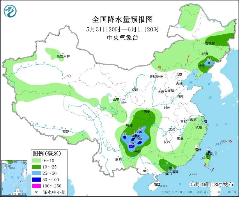 中央气象台预计,5月31日20时至6月1日20时,黑龙江东部、辽宁东部、陕西南部、四川东部、重庆、贵州、广东中部、台湾岛北部等地部分地区有中到大雨,其中,四川盆地南部、重庆中西部、贵州北部、云南东北部、台湾岛北部等地部分地区有暴雨或大暴雨。