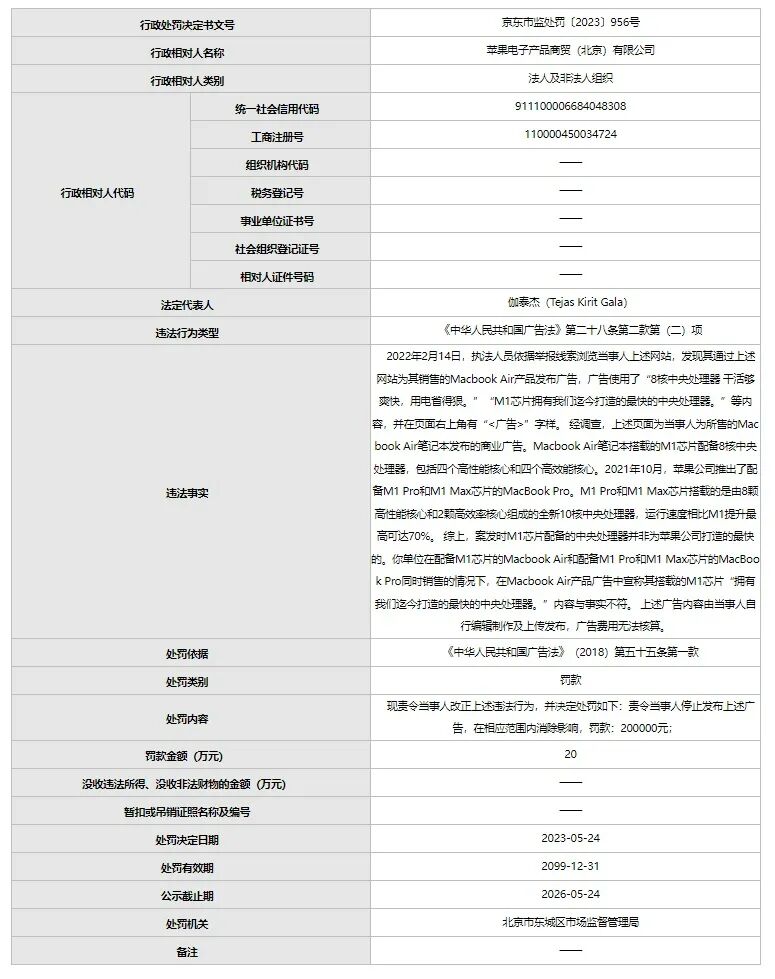 据北京市市场监督管理局网站5月31日消息,5月24日,苹果电子产品商贸(北京)有限公司因发布虚假广告被北京市东城区市场监督管理局处以20万元的行政处罚。