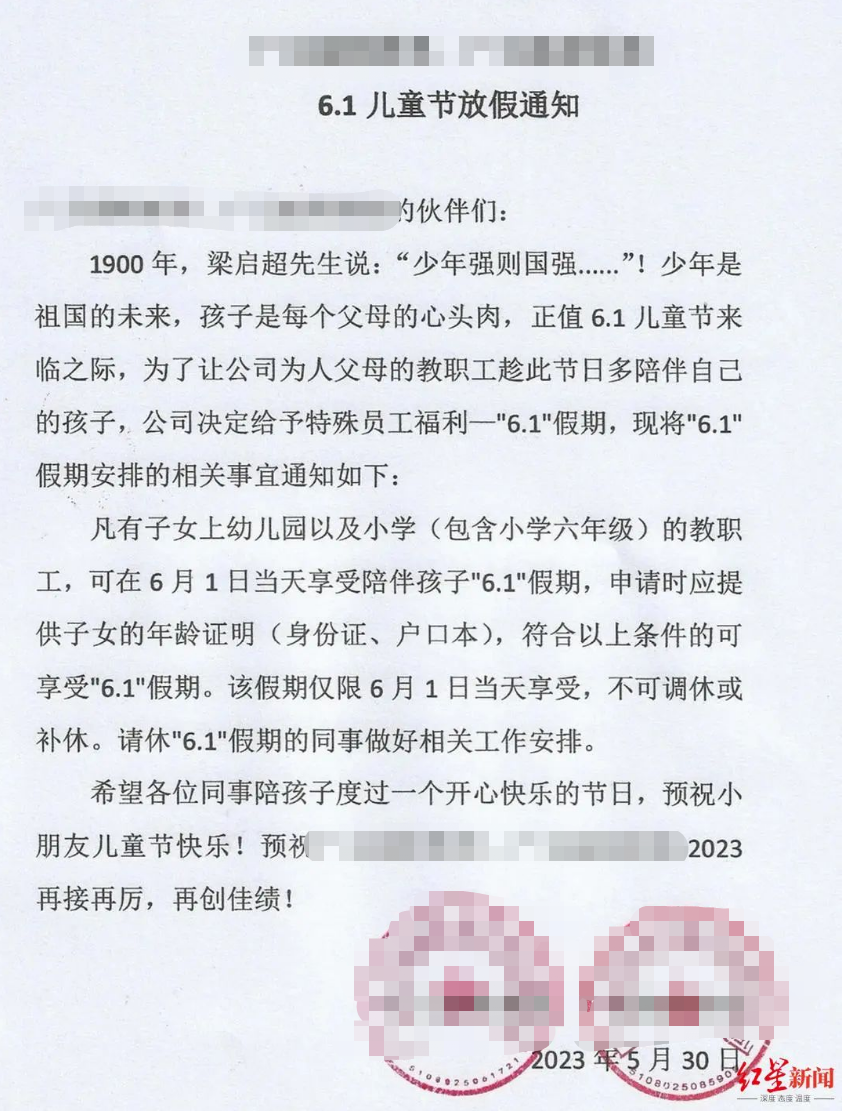5月31日,相关公司负责人告诉红星新闻记者,公司现有员工20余人,这次符合条件的有7人。“六一儿童节来了,孩子们将放假回家。如果孩子一个人在家,那么这个节日是不完美的,所以我们决定给符合条件的员工放假,让他们回家陪伴孩子,让孩子度过一个快乐的儿童节,同时也能增加亲子关系。”