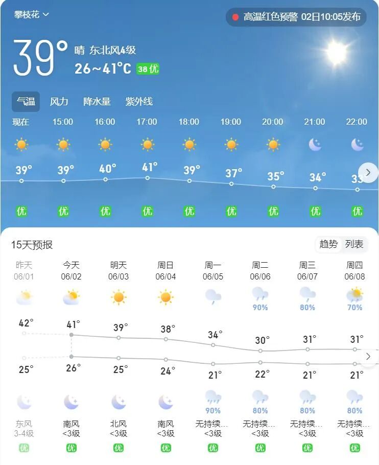 6月1日上午10时55分,攀枝花市气象台继续发布东区、西区高温红色预警信号:东区城区、银江镇,西区城区、格里坪镇等乡镇(街道)未来24小时内最高气温将升至40℃以上。请注意做好防暑降温工作,午后高温时段应尽量避免户外活动,注意用电用火安全。