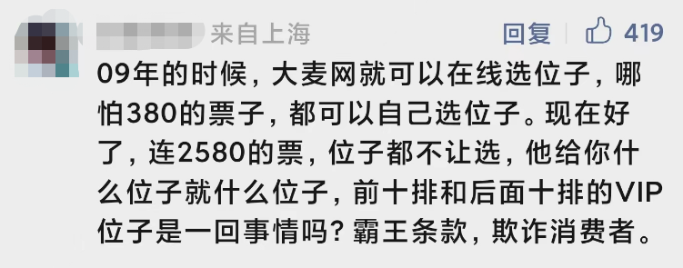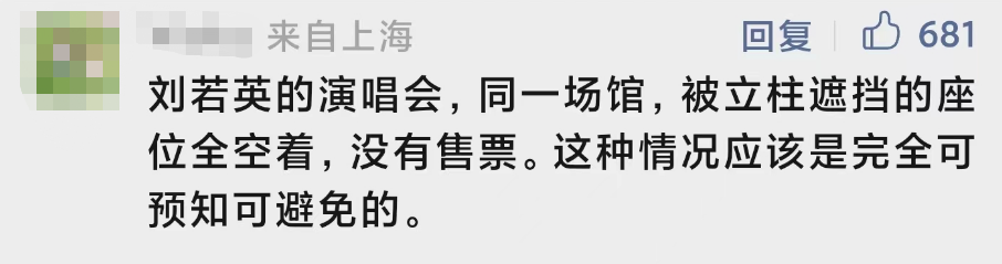 “真的很气人!我买的1299的票,本来想跟老公一起过520的,结果全程看柱子。要么售票时明示视线遮挡折价卖,要么这种位置就不卖,吃相太难看!”