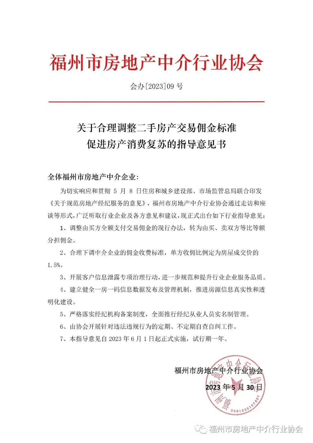 此前的5月30日,福州市房地产中介行业协会发布了《关于合理调整二手房产交易佣金标准促进房产消费复苏的指导意见书》,调整由买方全额支付交易佣金的现行办法,转为由买、卖双方等比等额分担佣金,并合理下调中介企业的佣金收费标准,单方收佣比例定为房屋成交价的1.5%。自6月1日起正式实施,试行期一年。