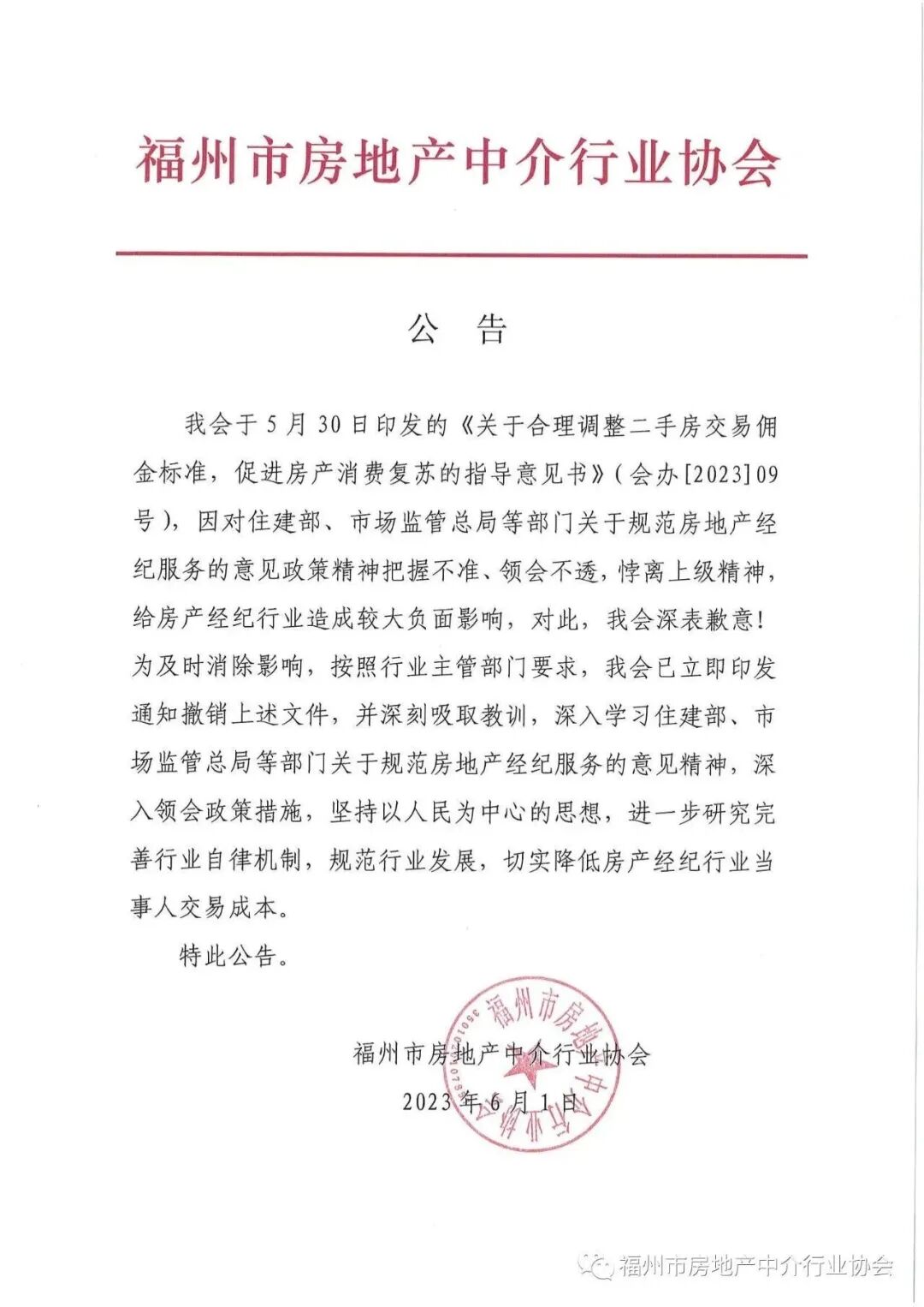 6月2日凌晨,福州市房地产中介行业协会发文致歉,撤销了5月30日发布的关于调整二手房交易佣金标准的指导意见。