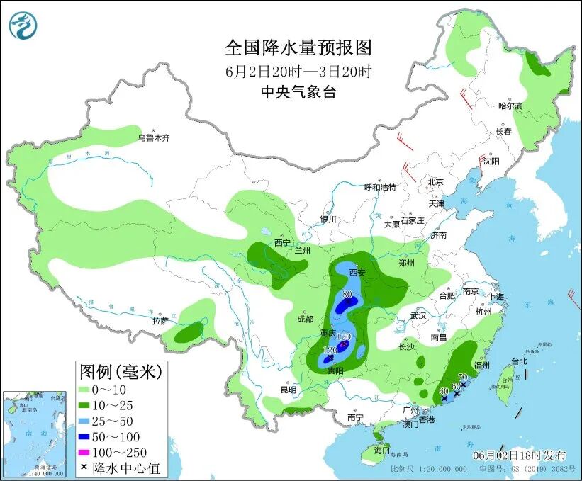 中央气象台预计,2日20时至3日20时,青海东南部、陕西南部、河南西南部、湖北西部和北部、四川东部、重庆、贵州大部、广东东部、福建中南部等地部分地区有中到大雨,其中,四川东北部、重庆西北部、贵州中北部等地局地有暴雨或大暴雨。