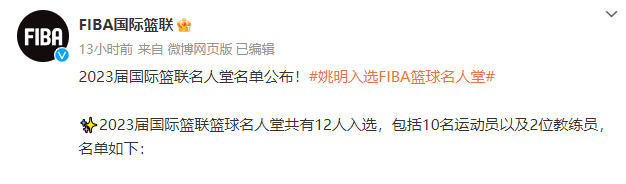 据了解,2023届国际篮联名人堂颁奖典礼将于8月23日在马尼拉举办。