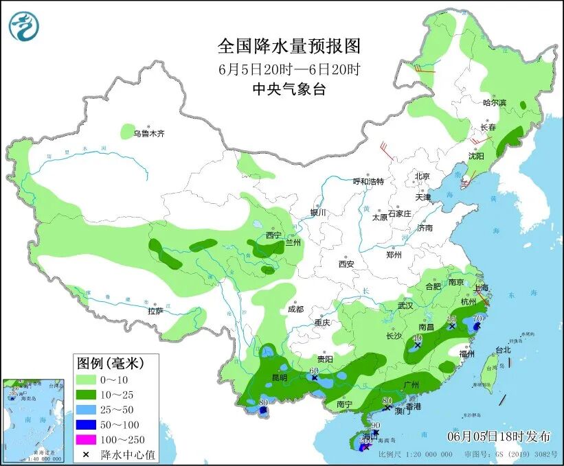 中央气象台预计,5日20时至6日20时,江南中南部、云南中东部、华南大部等地部分地区有中到大雨,局地暴雨,海南岛东南部局地大暴雨;东北地区东部、青藏高原中部部分地区有中雨。